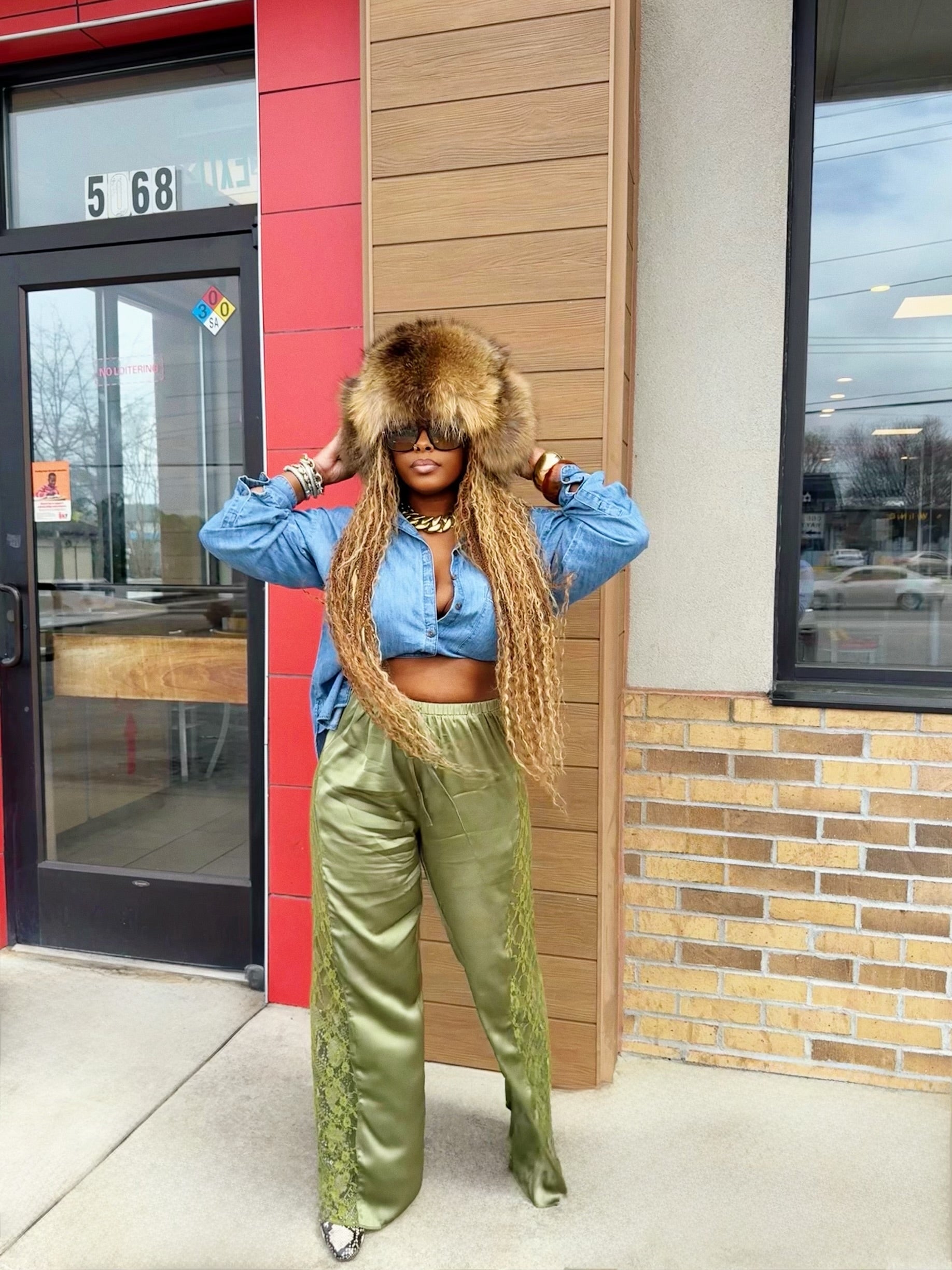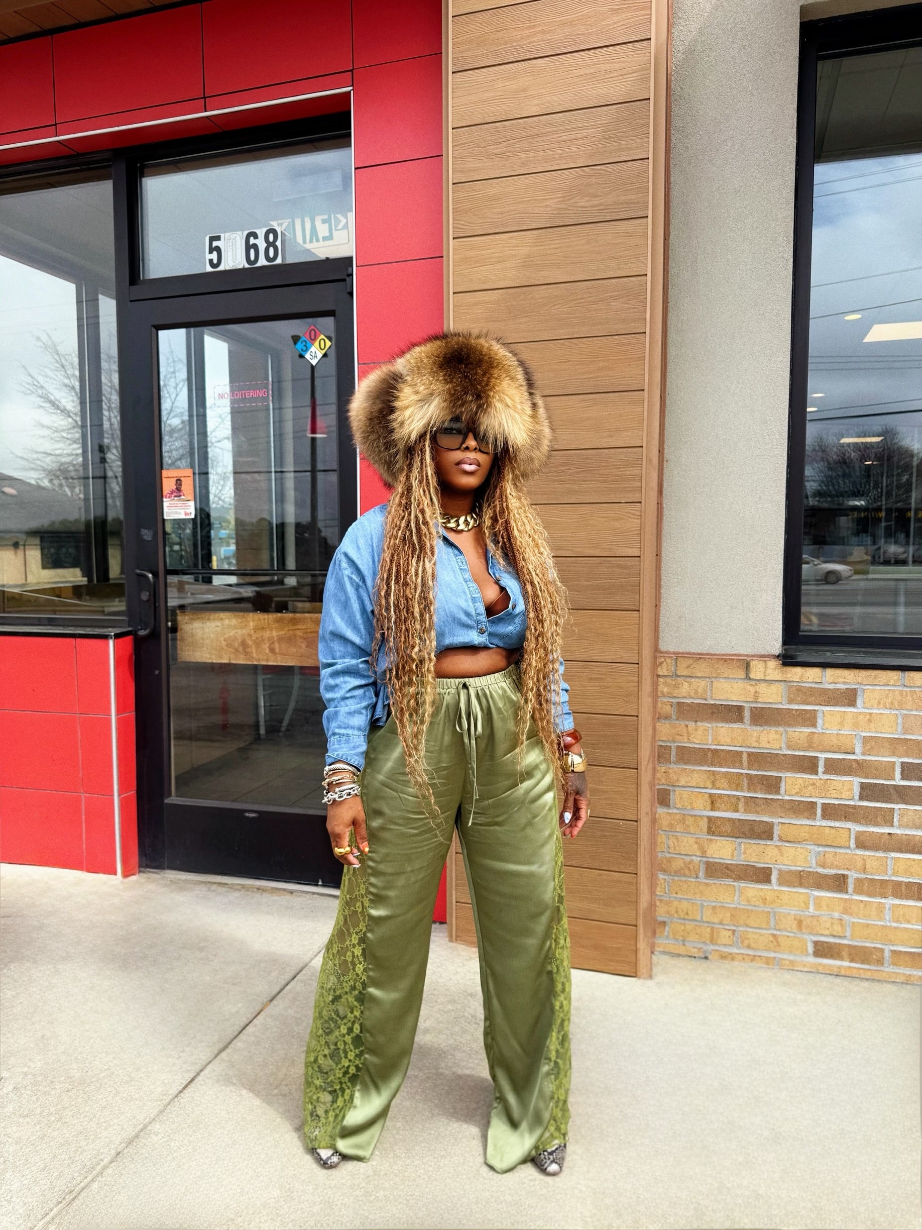 Model wearing a size medium, true to size, functional drawstring, ankle length pants, lace satin on both sides,This item has a processing time of 7-14 business days prior to being shipped out
